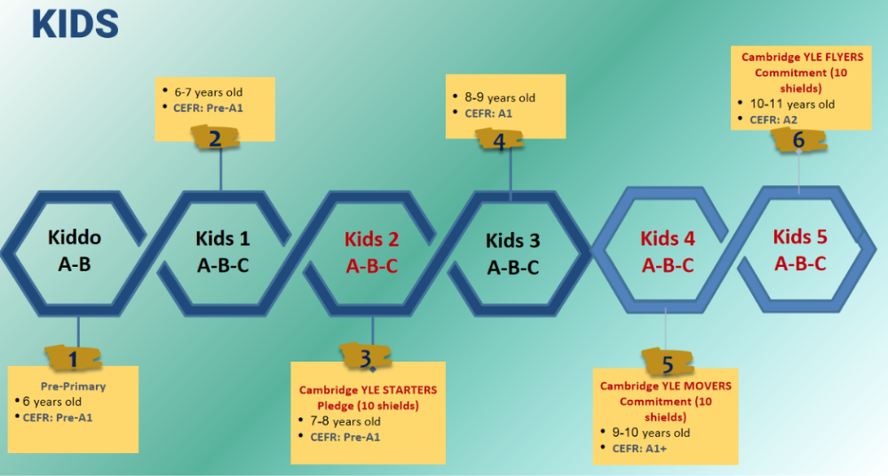 The Kids Program is structured into 6 levels and 17 courses, offering flexible learning formats in both OFFLINE and ONLINE modes. Each OFFLINE course consists of 25 lessons, totaling 37.5 hours over approximately 3 months, with two 1.5-hour lessons per week. In contrast, the ONLINE format includes 24 lessons, totaling 24 hours over the same period, with two 1-hour lessons per week. Class sizes are kept optimal to ensure effective learning: 10–15 students for offline classes and 1–3 students for online classes. All classes are led by 100% foreign teachers, accompanied by local teaching assistants in the early levels (Kiddo, Kids 1, and Kids 2), ensuring a supportive and engaging learning environment for young learners. 4 ADD-ONS sessions at the end of each course to help students review, develop moral values, practice soft skills, and improve presentation and teamwork abilities.